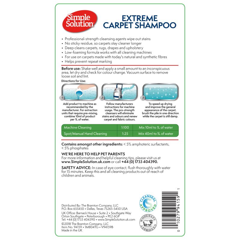 - PROFESSIONAL STRENGTH – Simple Solution Extreme Carpet Shampoo gives you professional-strength cleansing agents to wipe out stains. Low-foaming formula works with all cleaning machines.
