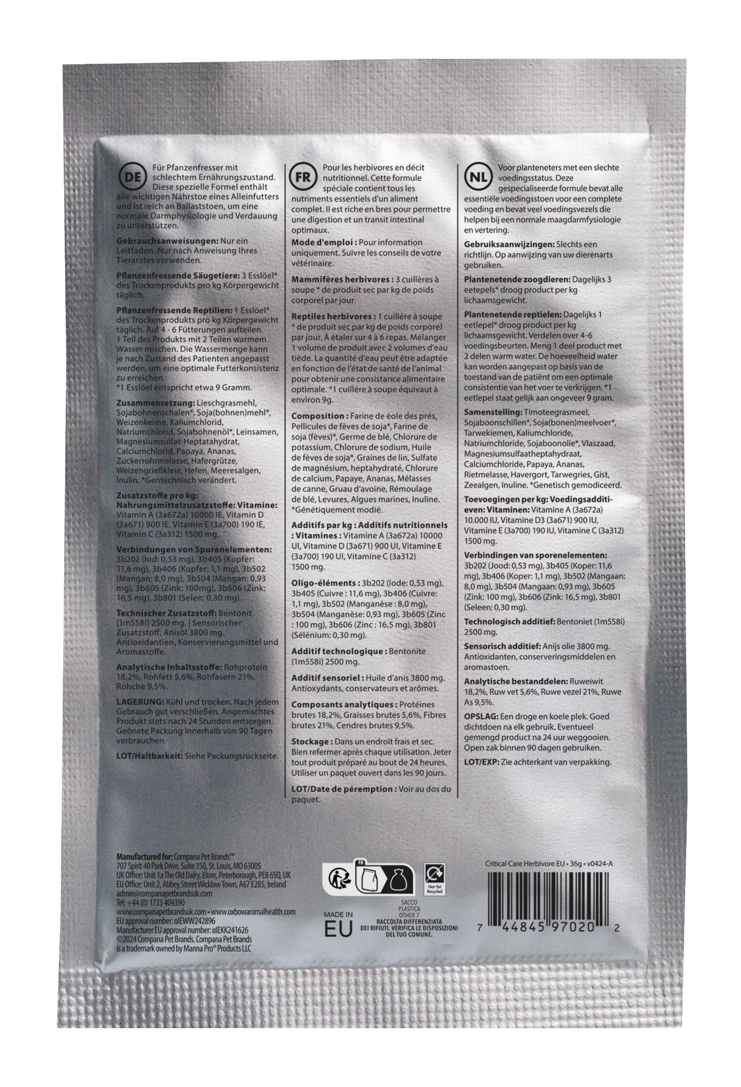 - For herbivores with poor nutritional status. This specialized formula contains all the essential nutrients of a complete diet and is high in fibre to help support normal gut physiology and digestion.