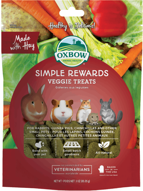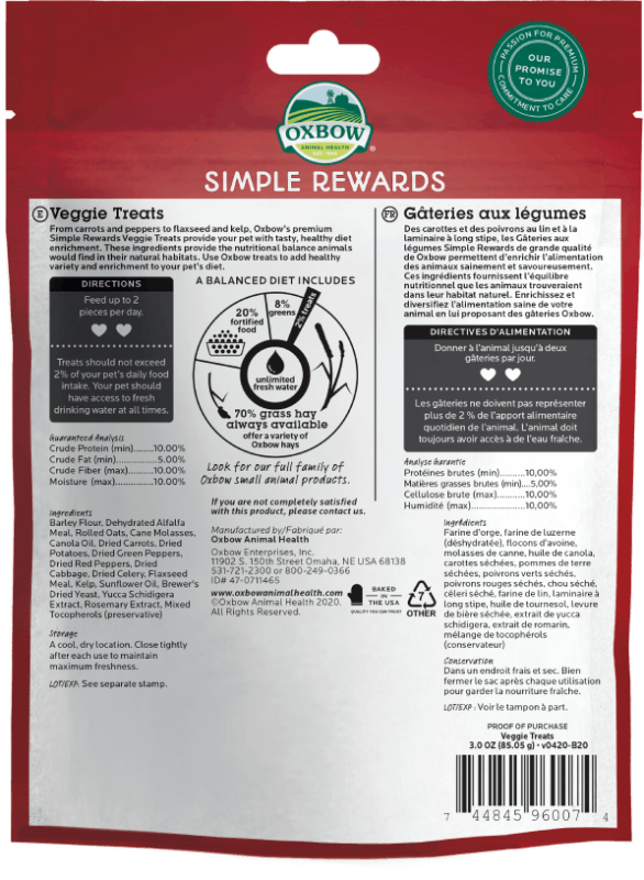 From carrots and peppers to flaxseed and kelp, Oxbow’s premium Simple Rewards Veggie Treats provide your pet with tasty, healthy diet enrichment. These ingredients provide the nutritional balance animals would find in their natural habitats. Use Oxbow treats to add healthy variety and enrichment to your pet’s diet.