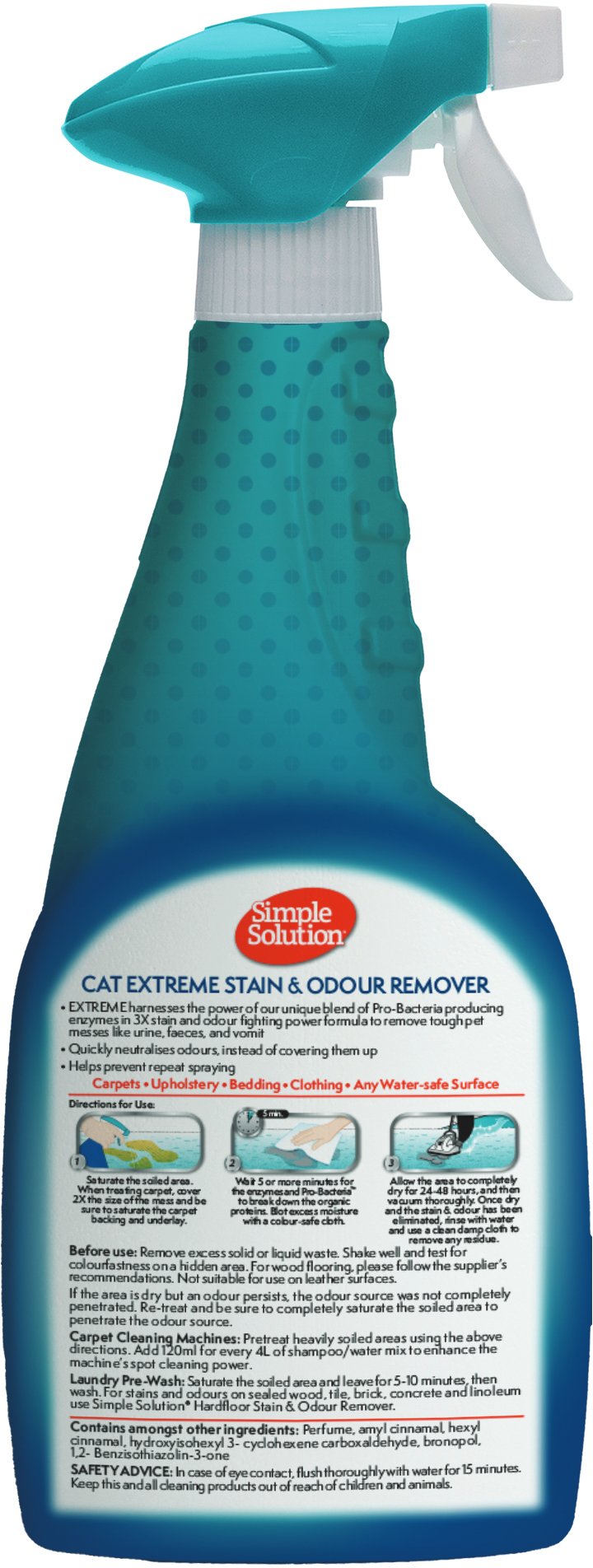 - FOR TOUGH CAT MESSES – Simple Solution Cat Extreme Stain and Odor Remover is specifically formulated to eliminate tough cat odours and stains, including urine, faeces, and vomit.