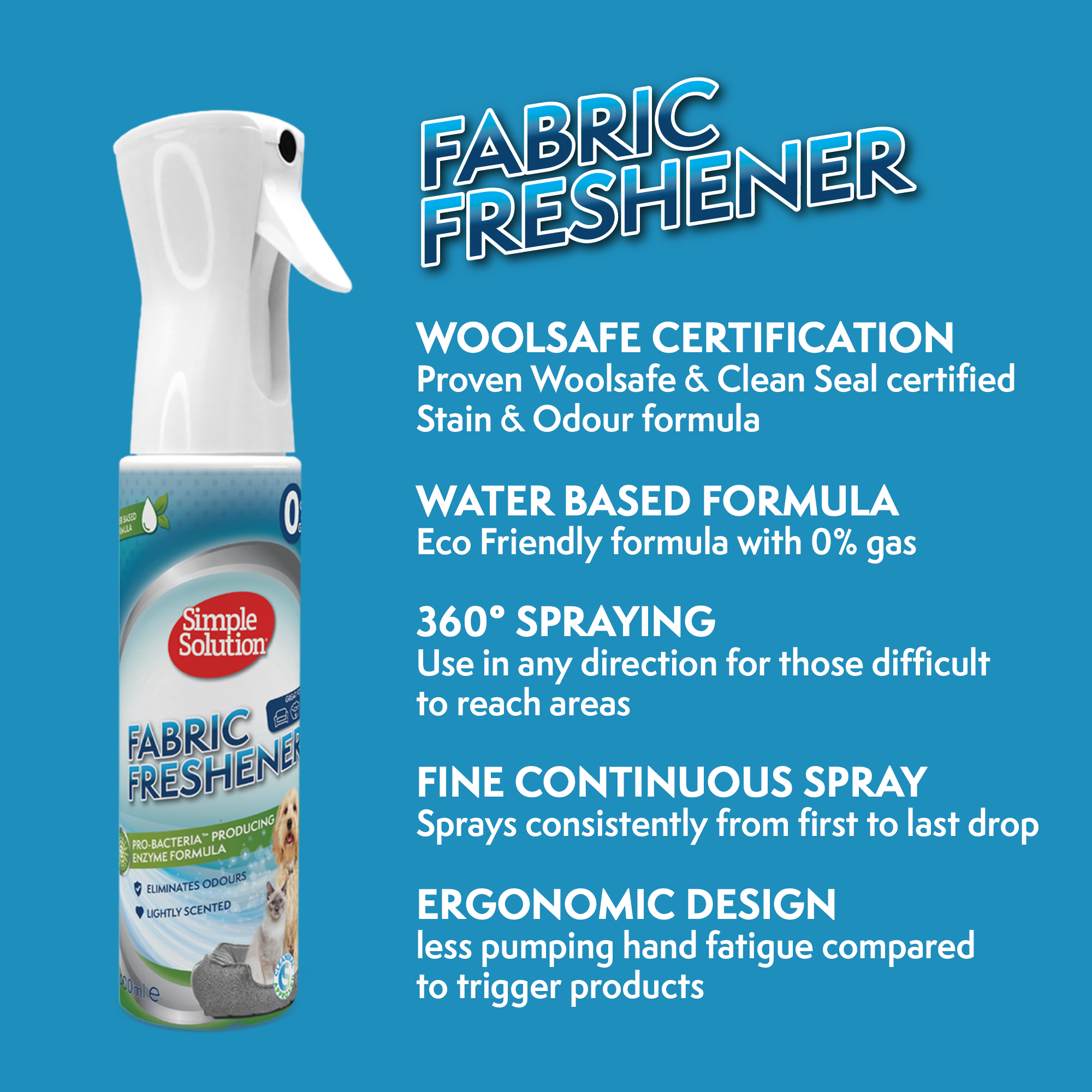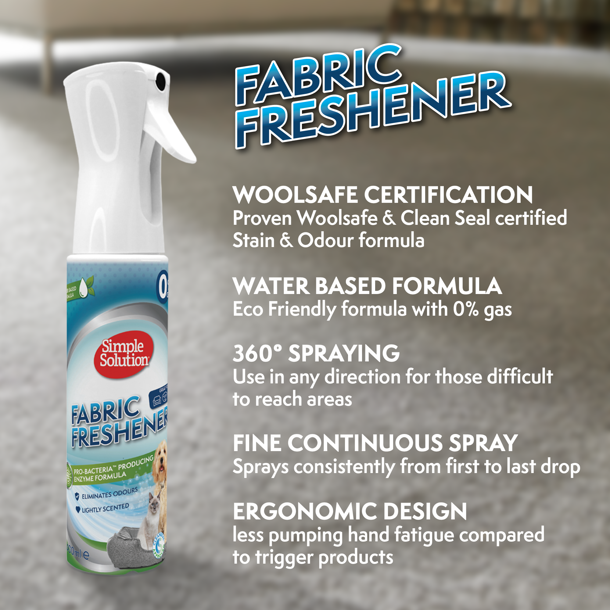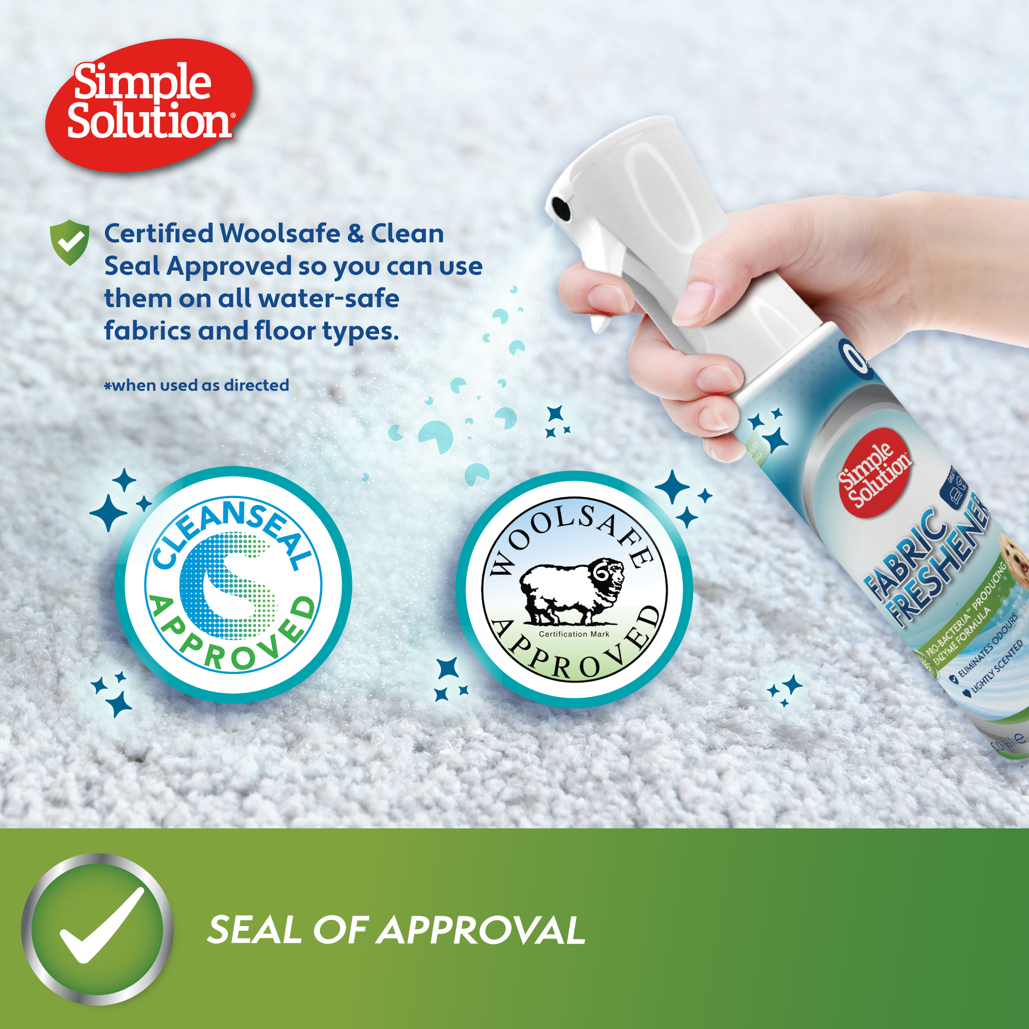 Freshen up hard-to-wash fabrics with a Clean Seal and Woolsafe Certified formula, featuring a new spray technology combined with a proven pro-bacteria-producing enzyme formula. With a light fresh linen scent and no heavy perfumes, it works effectively to remove odours and freshen upholstery, dog bedding, and car boots. It’s approved by the Carpets and Rug Institute and is made to be safe for use around children and pets when applied as directed.