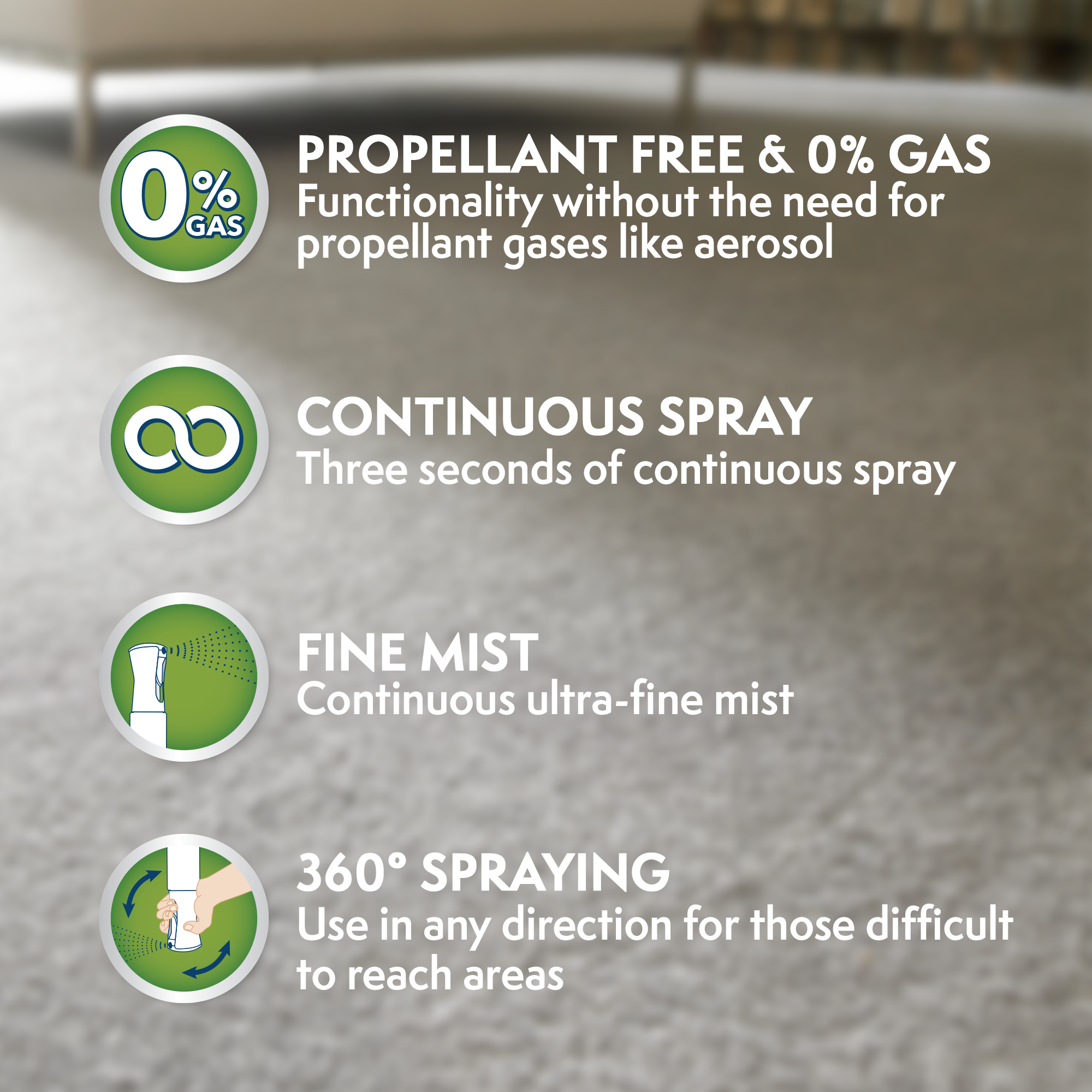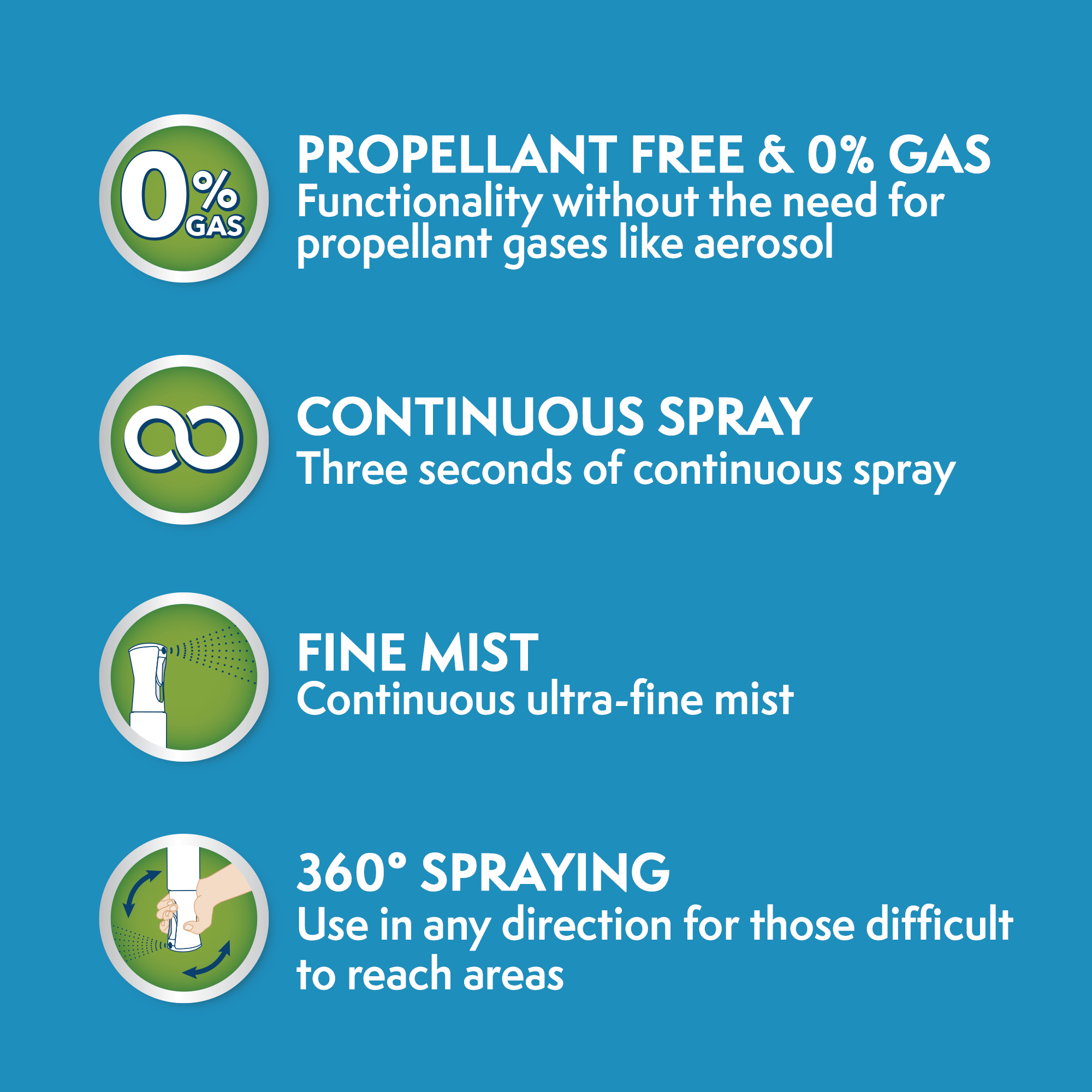• ECO-FRIENDLY DESIGN: Propellant-free and 0% gas spray, offering a sustainable and powerful three-second continuous mist, covering large areas easily and quickly.