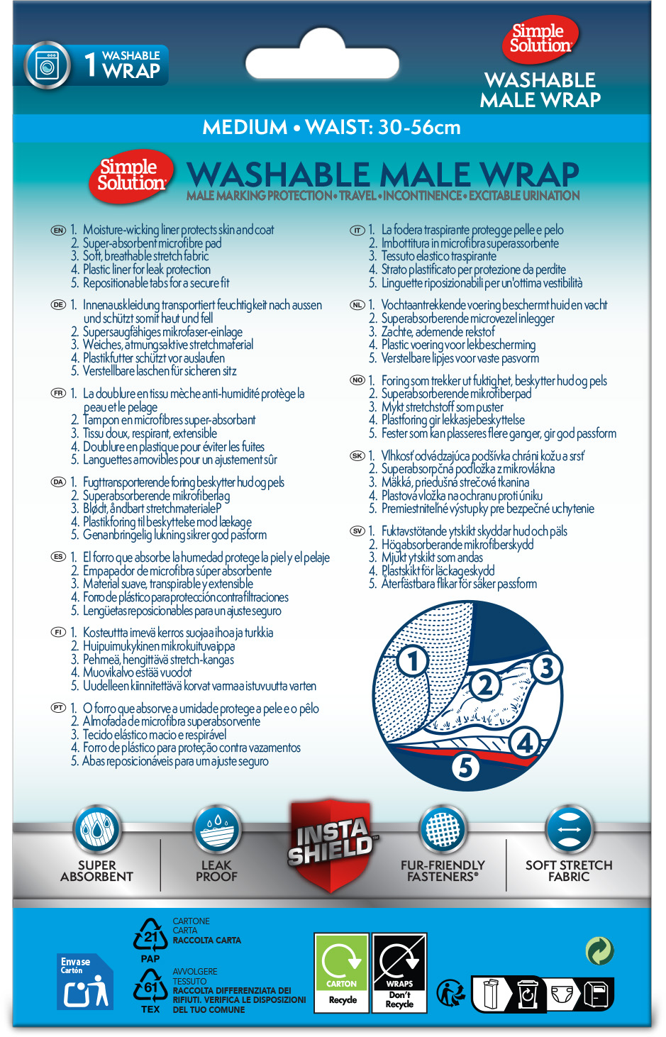 - SIMPLE AND CONVENIENT – Contains 1 machine-washable wrap per package. For female dogs, use Simple Solution Washable Female Dog Diapers.
