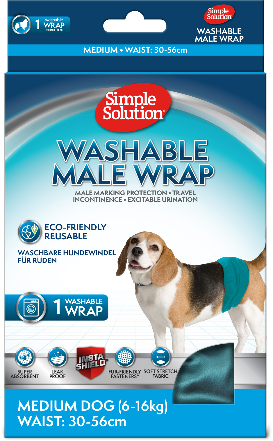 - TAILORED TO FIT – Simple Solution Medium, Washable Male Dog Wraps are for male dogs (6 – 16kg) with a waist size of 30 – 56cm. For optimal fit, measure your dog’s waist near his hind legs and refer to our new and improved sizing chart.