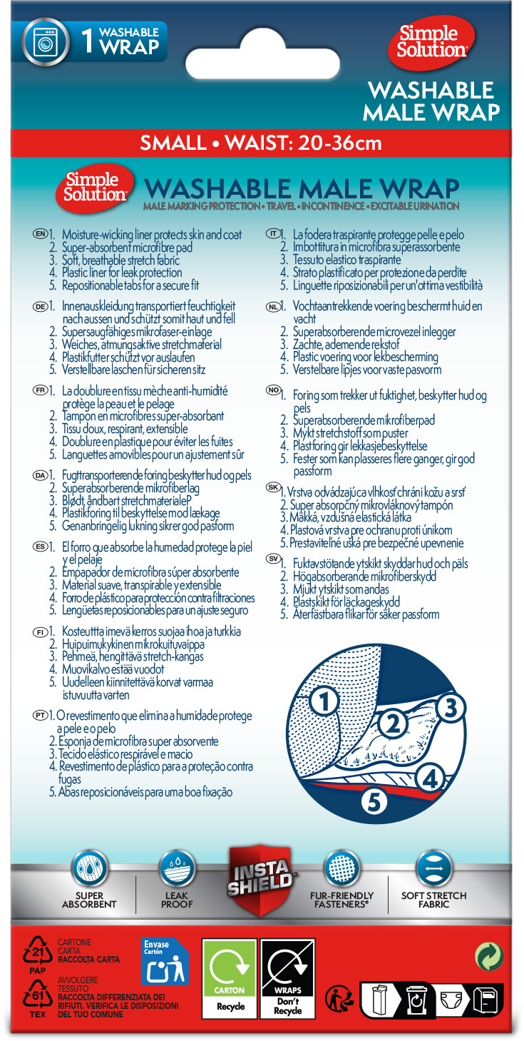 • SIMPLE AND CONVENIENT – Contains 1 machine-washable wrap per package. For female dogs, use Simple Solution Washable Female Dog Diapers.